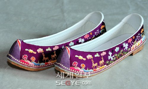 Á¶¼±½Ã´ë ºÎ³àÀÚ°¡ ½Å´ø °®½ÅÀÎ ´çÇý. ÄÚ¿Í µÚ²ÞÄ¡¿¡ ´çÃʹ®(ÓÐõ®Ùþ)À» ³õ¾Æ ¸¸µç ¸¶¸¥ ½ÅÀ¸·Î, ¾ÈÀº À¶ °°Àº Ç«½ÅÇÑ °¨À¸·Î ÇÏ°í ¹Ù±ùÀº °¡Á×À» ºñ´ÜÀ¸·Î ½Î¼ ¸¸µé¾ú´Ù.